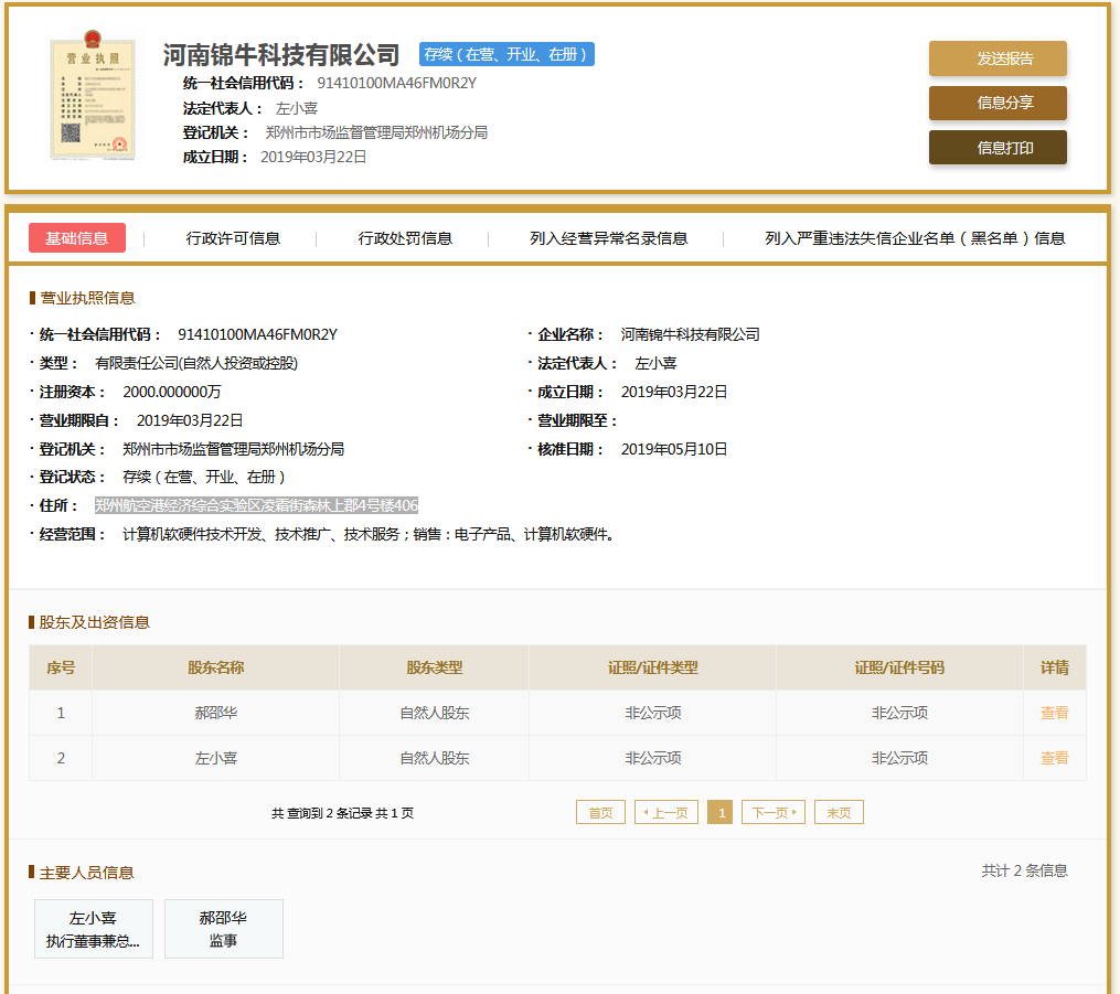 | 注册资本 | 2000 万元 | 注册地址 | 郑州航空港经济综合实验区凌霜街森林上郡4号楼406 |