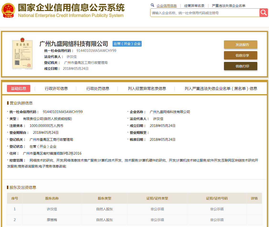 | 公司名称 | 广州九盛网络科技有限公司 | 信用代码 | 91440101MA5AWCHY99 |