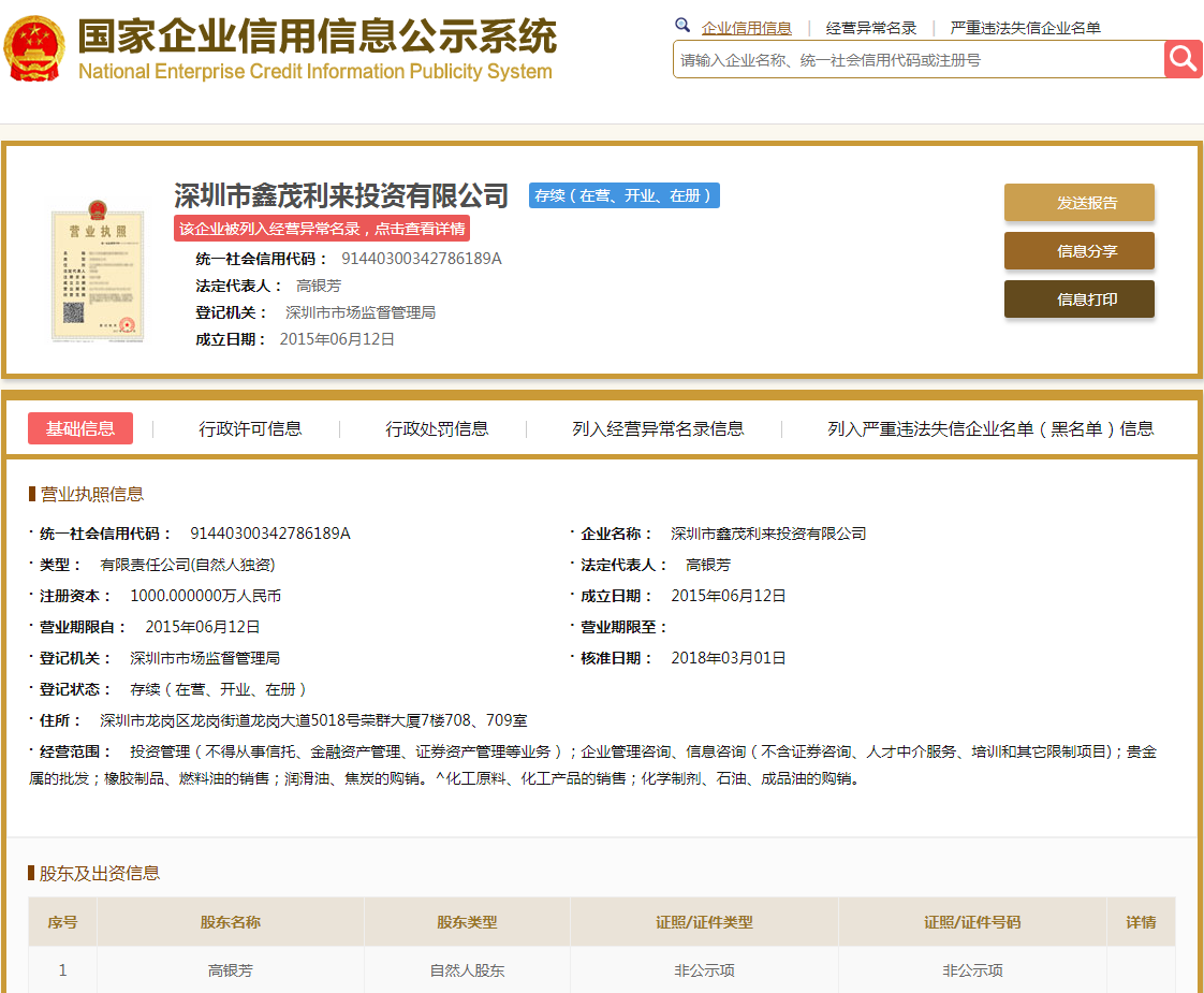 | 公司名称 | 深圳市鑫茂利来投资有限公司 | 信用代码 | 91440300342786189A |