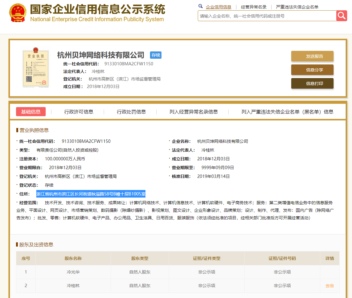 | 公司名称 | 杭州贝坤网络科技有限公司 | 信用代码 | 91330108MA2CFW1150 |