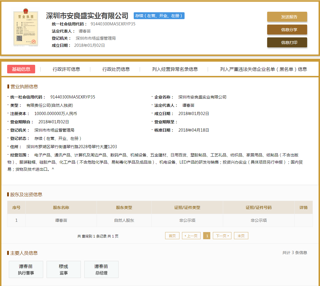 | 公司名称 | 深圳市安良盛实业有限公司 | 信用代码 | 91440300MA5EXRYP35 |