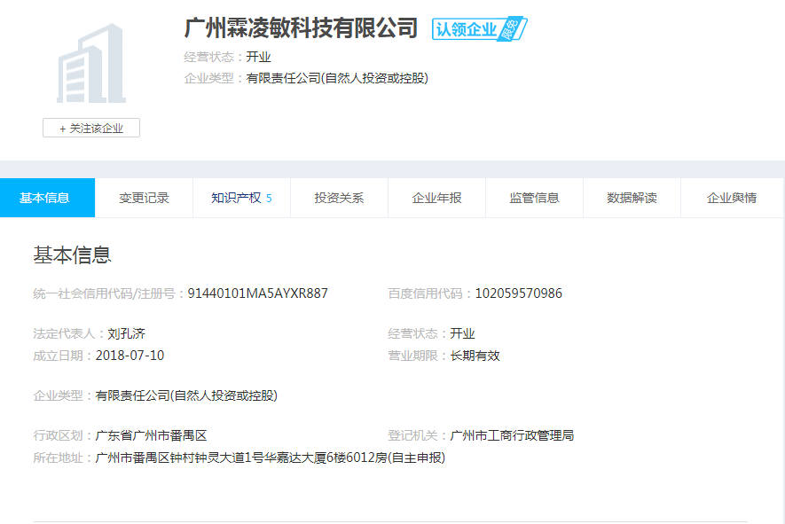 | 公司名称 | 广州霖凌敏科技有限公司 | 信用代码 | 91440101MA5AYXR887 |
