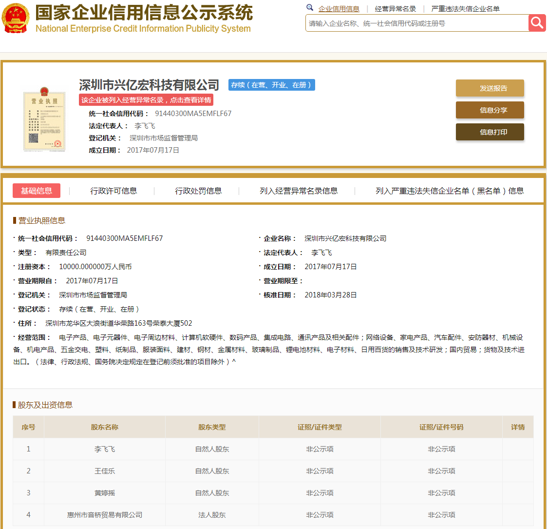 金元速配(86827.com、gp009.com )配资平台,运营主体“深圳市兴亿宏科技有限公司”已被工商纳入异常经营名单。