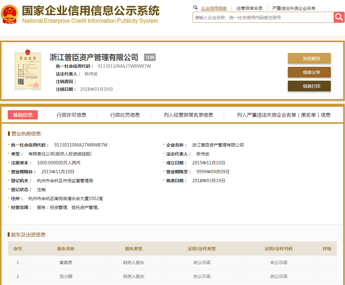 | 公司名称 | 浙江普臣资产管理有限公司 | 信用代码 | 91330110MA27W8WB7W |