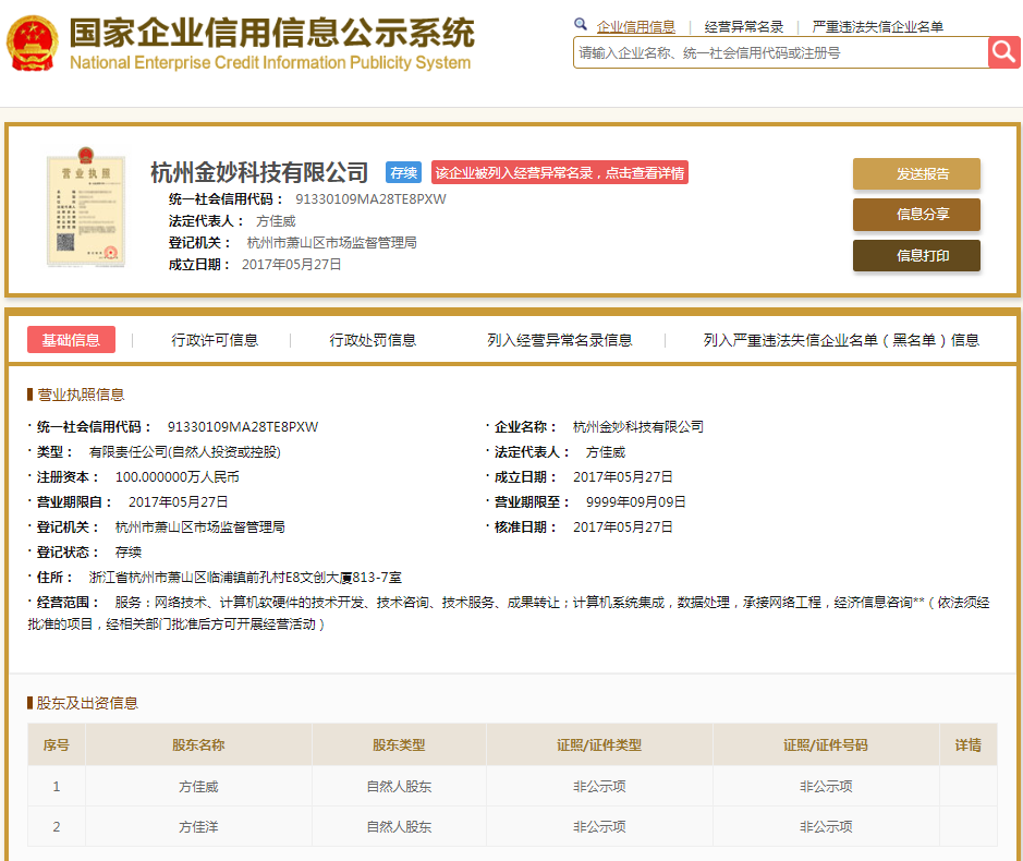 | 公司名称 | 杭州金妙科技有限公司 | 信用代码 | 91330109MA28TE8PXW |