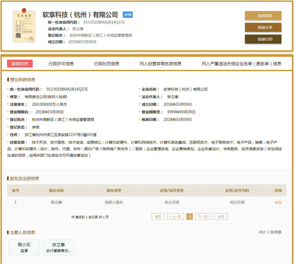 | 公司名称 | 软享科技(杭州)有限公司 | 信用代码 | 91330108MA2B14Q37E |