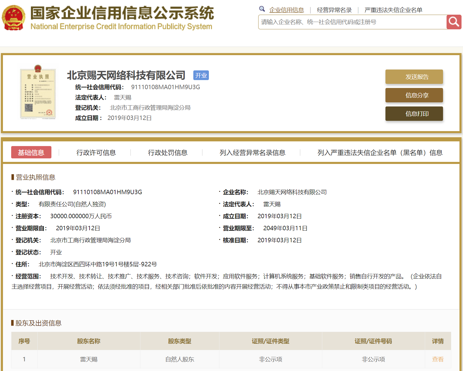 | 公司名称 | 北京赐天网络科技有限公司 | 信用代码 | 91110108MA01HM9U3G |