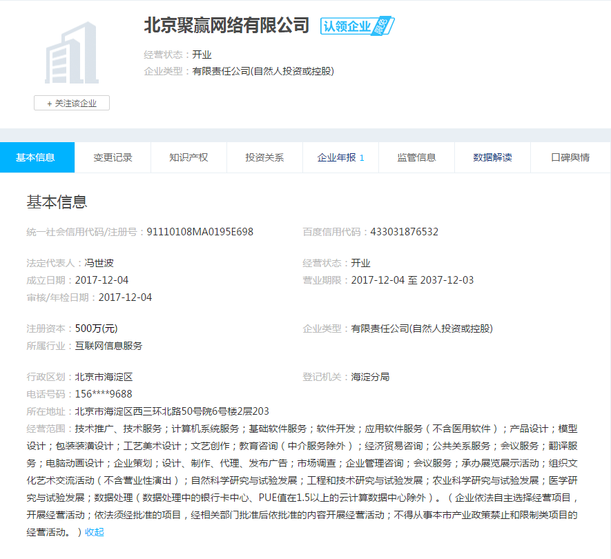 | 公司名称 | 北京聚赢网络有限公司 | 信用代码 | 91110108MA0195E698 |