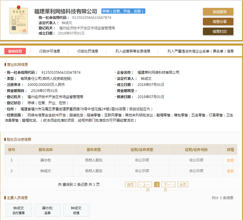 | 公司名称 | 福建莱利网络科技有限公司 | 信用代码 | 91350105MA330ATB74 |
