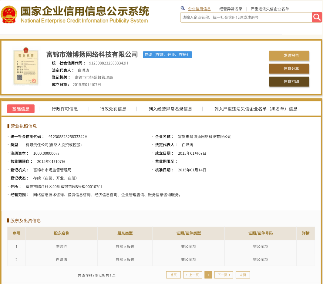 | 公司名称 | 富锦市瀚博扬网络科技有限公司 | 信用代码 | 91230882325833342H |