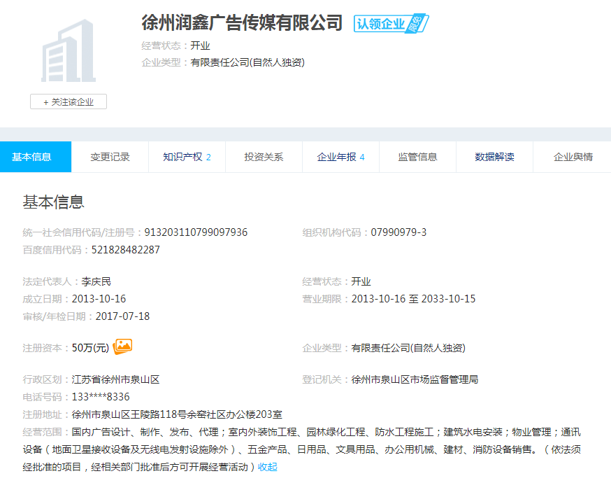 | 公司名称 | 徐州润鑫广告传媒有限公司 | 信用代码 | 913203110799097936 |