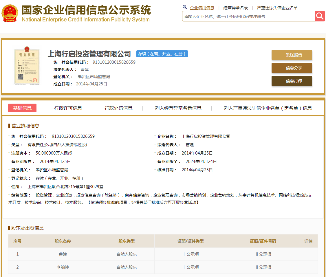 | 公司名称 | 上海行启投资管理有限公司 | 信用代码 | 913101203015826659 |