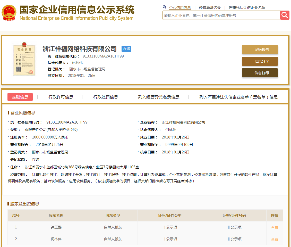 | 公司名称 | 浙江祥福网络科技有限公司 | 信用代码 | 91331100MA2A1CHF99 |