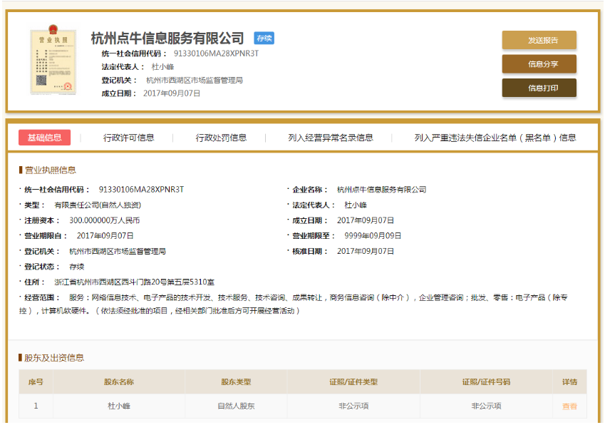 | 公司名称 | 杭州点牛信息服务有限公司 | 信用代码 | 91330106MA28XPNR3T |