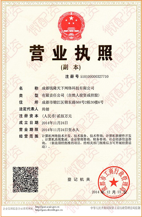 | 公司名称 | 成都钱隆天下网络科技有限公司 | 信用代码 | 915101003946299517 |