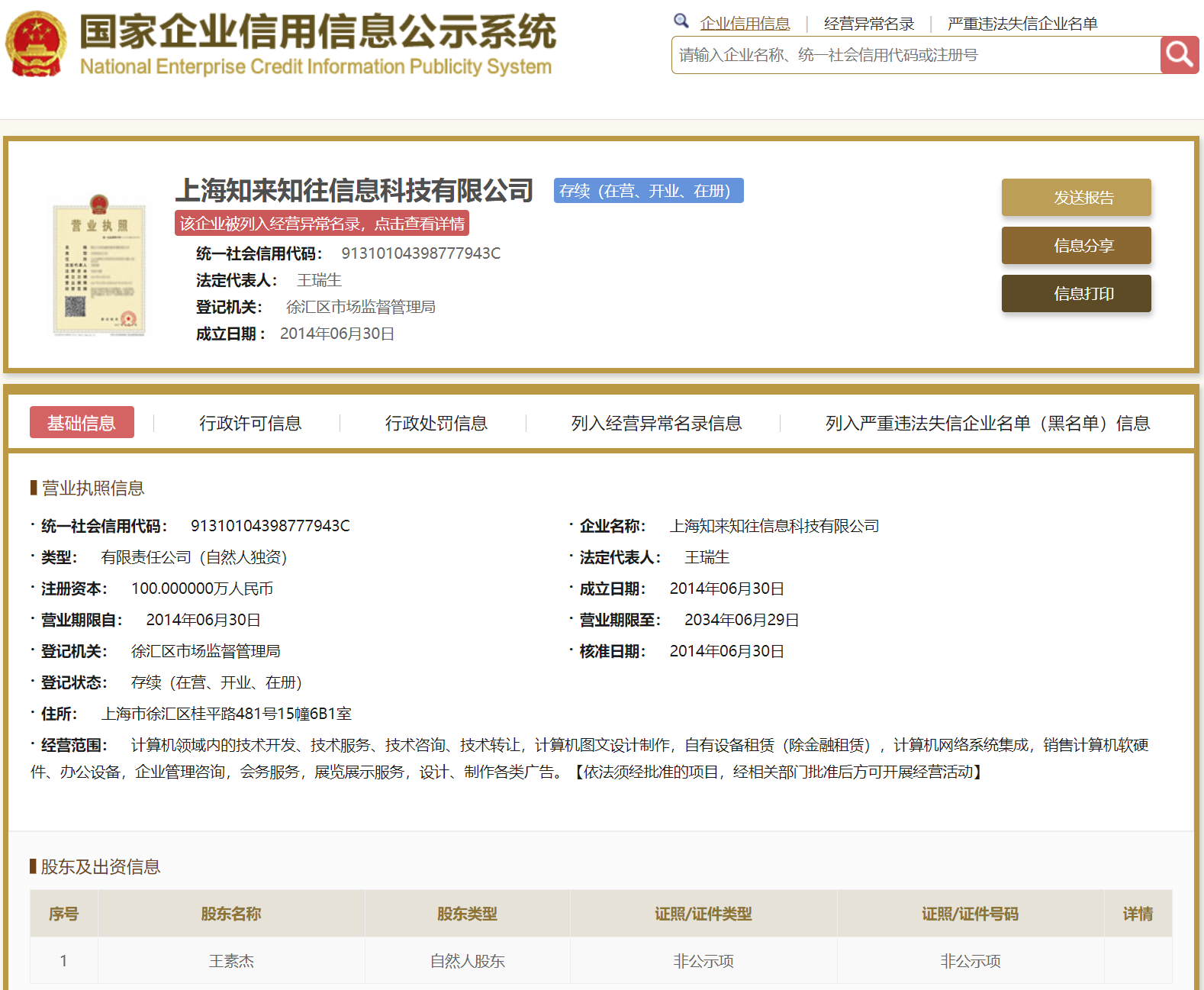 上海知来知往信息科技有限公司,通过登记的住所或者经营场所无法联系,已被上海市徐汇区市场监督管理局列为经营异常。