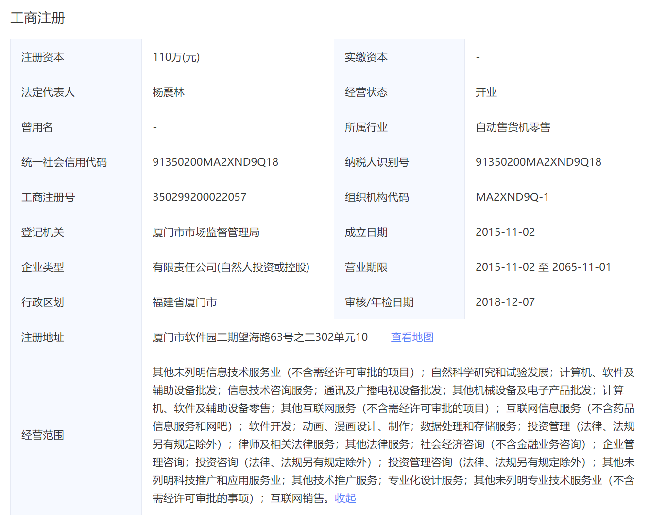 | 注册资本 | 110.00 万元 | 注册地址 | 厦门市软件园二期望海路63号之二302单元10 |
