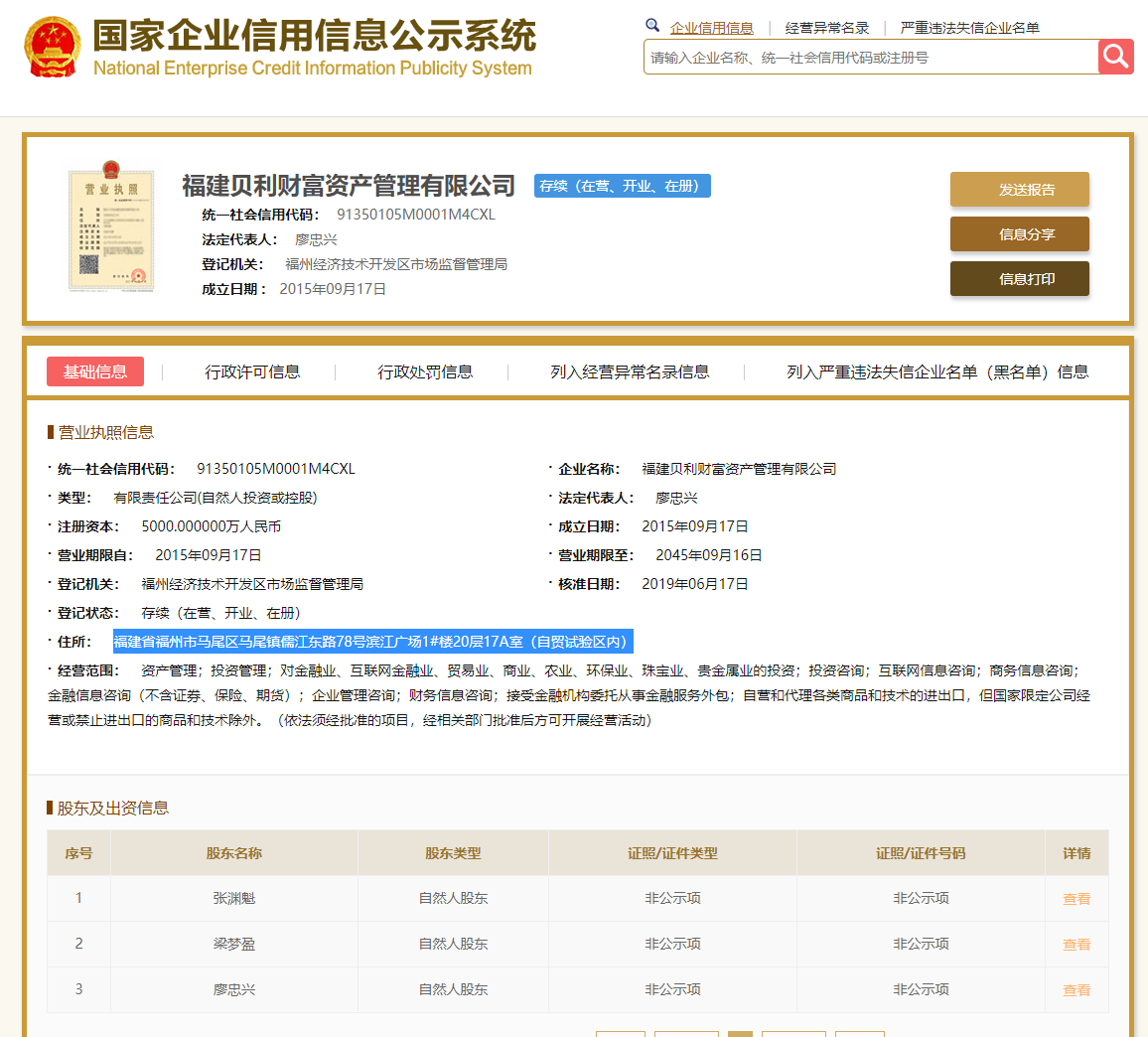 | 公司名称 | 福建贝利财富资产管理有限公司 | 信用代码 | 91350105M0001M4CXL |