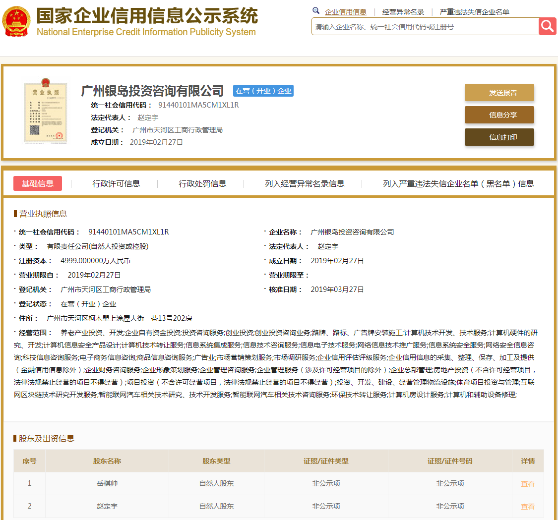 | 公司名称 | 广州银岛投资咨询有限公司 | 信用代码 | 91440101MA5CM1XL1R |