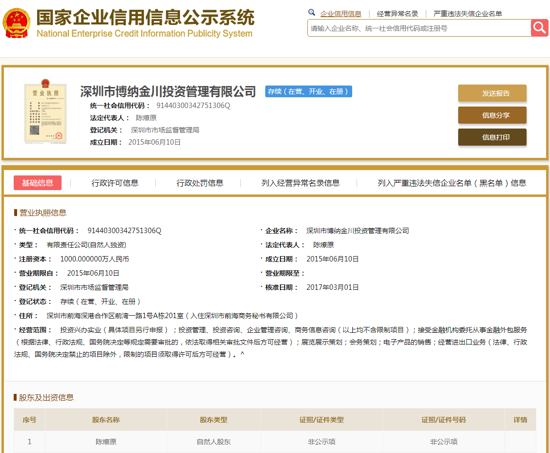 | 公司名称 | 深圳市博纳金川投资管理有限公司 | 信用代码 | 91440300342751306Q |
