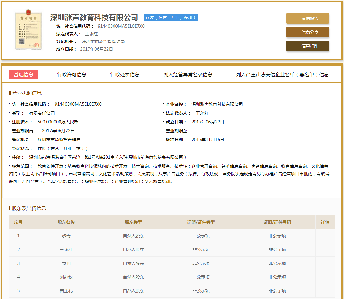 | 公司名称 | 深圳涨声教育科技有限公司 | 信用代码 | 91440300MA5EL0E7X0 |