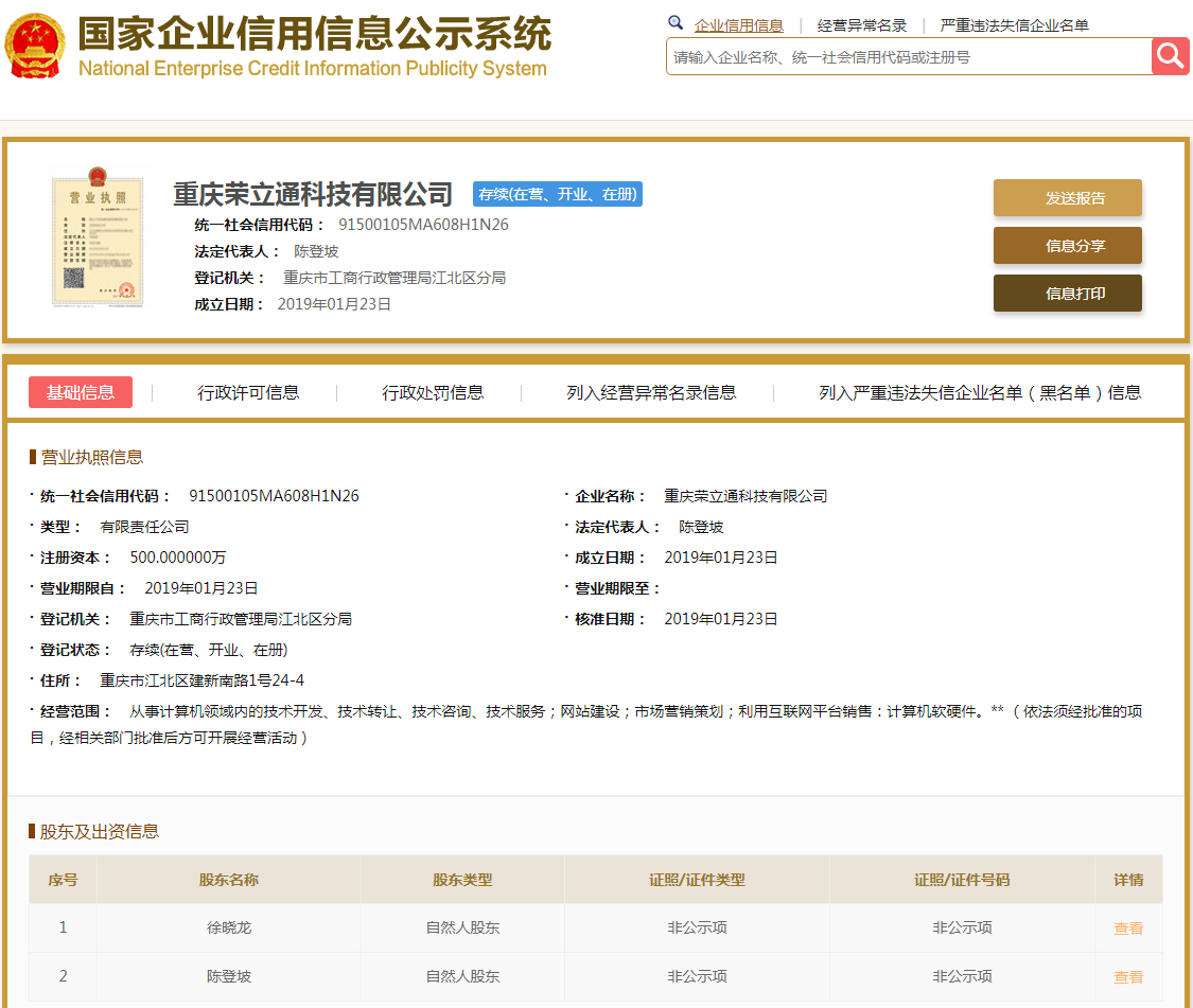 | 公司名称 | 重庆荣立通科技有限公司 | 信用代码 | 91500105MA608H1N26 |