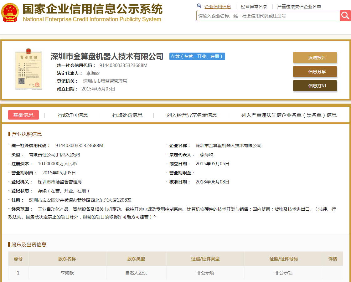 | 公司名称 | 深圳市金算盘机器人技术有限公司 | 信用代码 | 91440300335323688M |