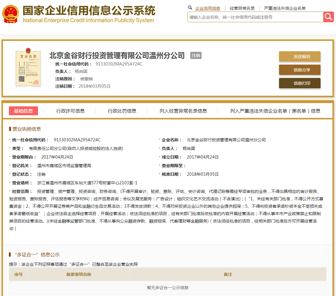 | 公司名称 | 北京金谷财行投资管理有限公司温州分公司 | 信用代码 | 91330302MA295A724C |