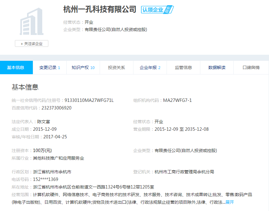 | 公司名称 | 杭州一孔科技有限公司 | 信用代码 | 91330110MA27WFG71L |