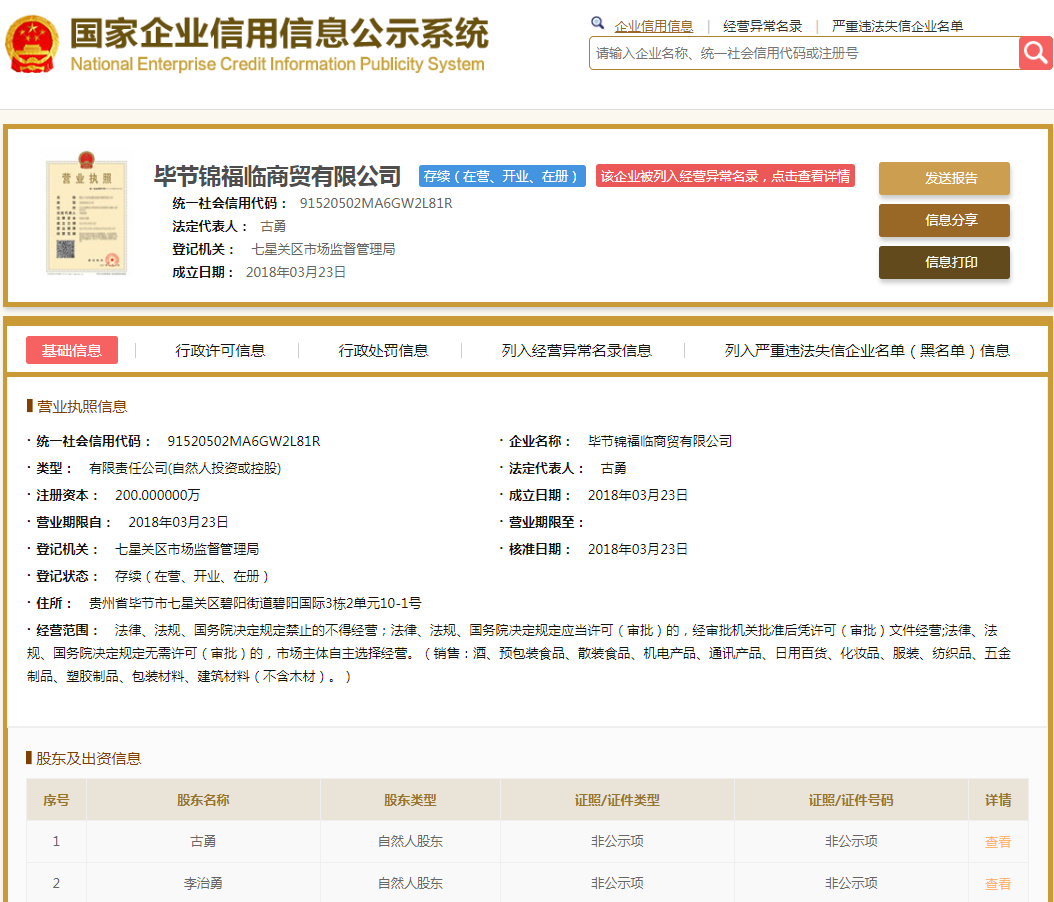 | 公司名称 | 毕节锦福临商贸有限公司 | 信用代码 | 91520502MA6GW2L81R |