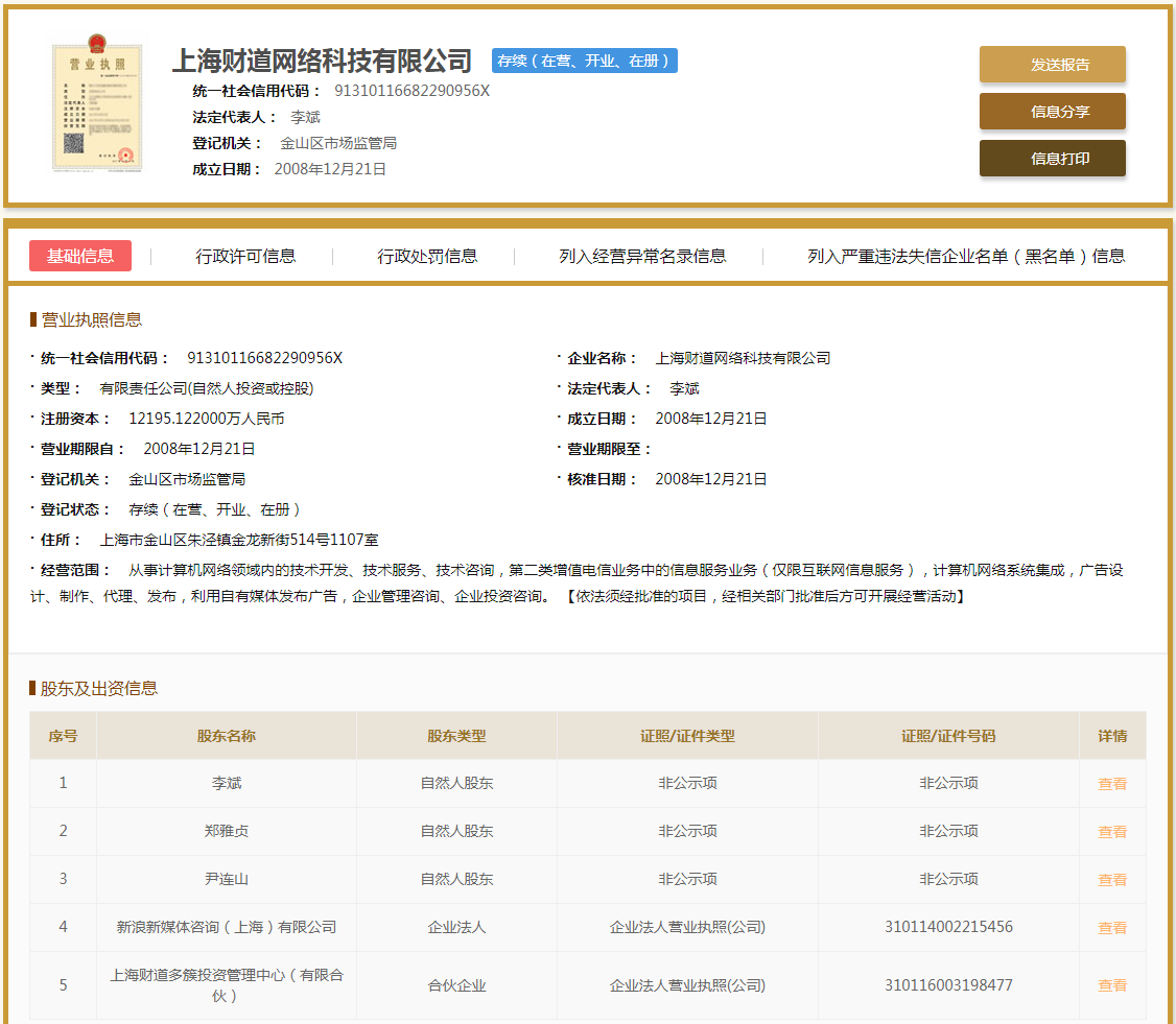 | 公司名称 | 上海财道网络科技有限公司 | 信用代码 | 91310116682290956X |