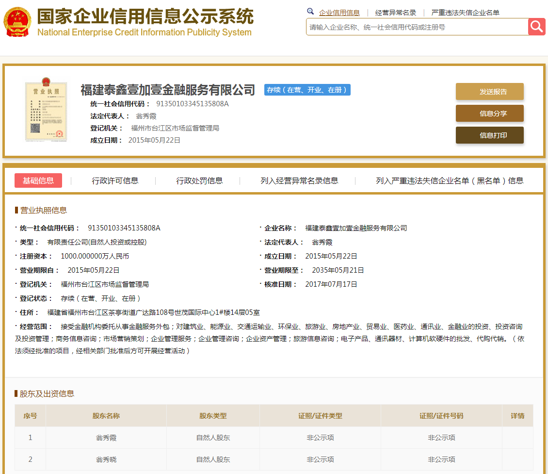 | 公司名称 | 福建泰鑫壹加壹金融服务有限公司 | 信用代码 | 91350103345135808A |