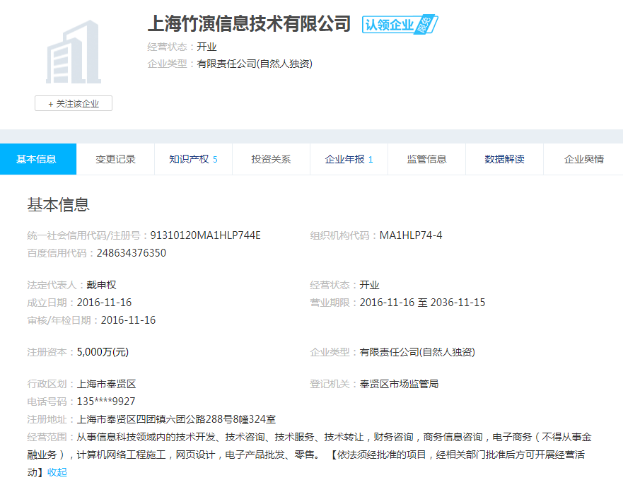 | 公司名称 | 上海竹演信息技术有限公司 | 信用代码 | 91310120MA1HLP744E |