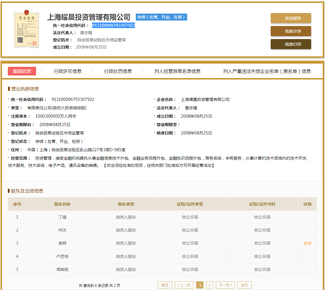 | 公司名称 | 上海耀晨投资管理有限公司 | 信用代码 | 913100006793307502 |