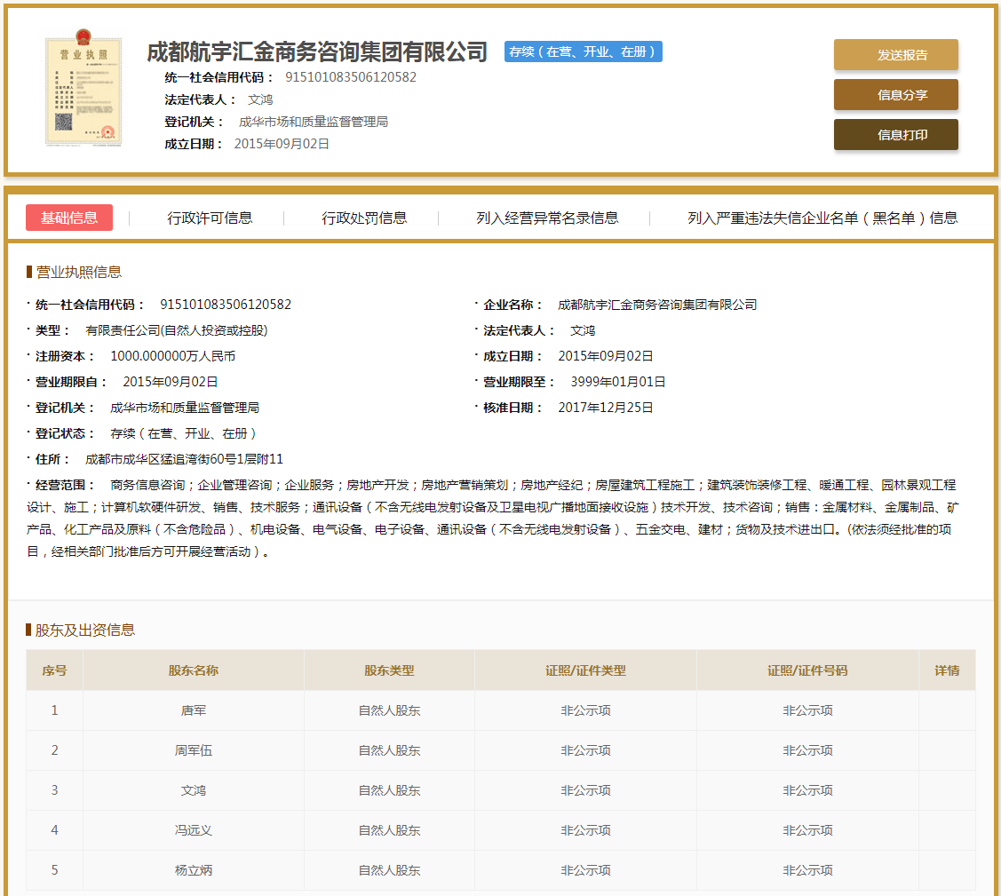| 公司名称 | 成都航宇汇金商务咨询集团有限公司 | 信用代码 | 915101083506120582 |