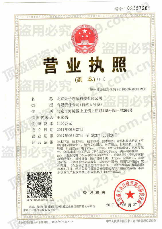 | 公司名称 | 北京天子东源科技有限公司 | 信用代码 | 91110108MA00FL7M0C |