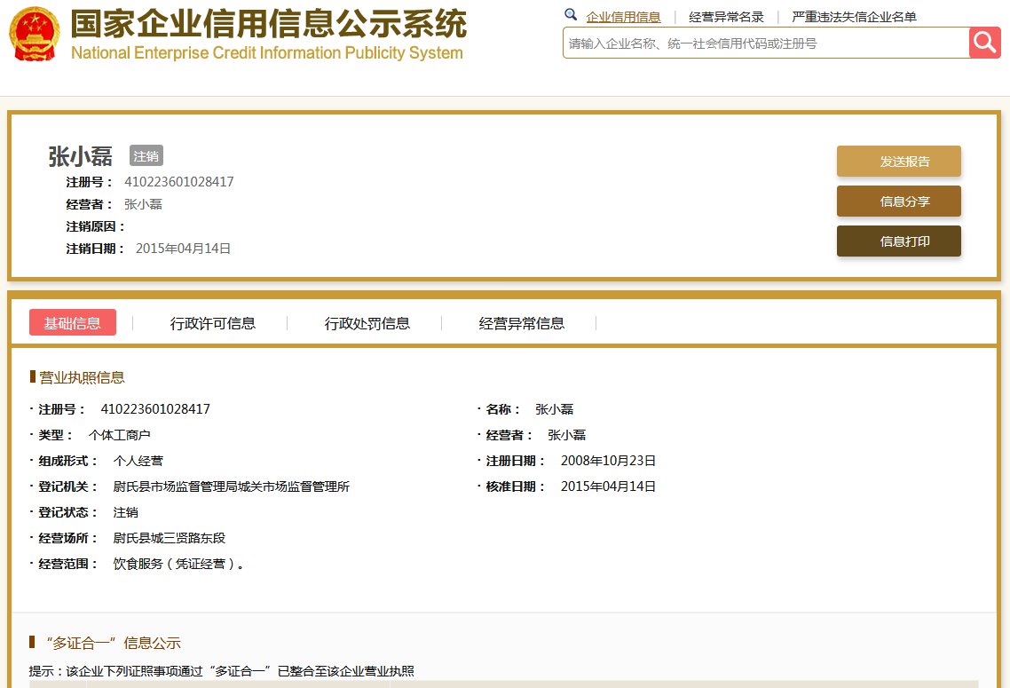 | 公司名称 | 张小磊 | 信用代码 | 410223601028417 |
