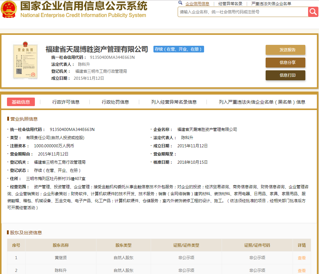 | 公司名称 | 福建省天晟博胜资产管理有限公司 | 信用代码 | 91350400MA344E663N |