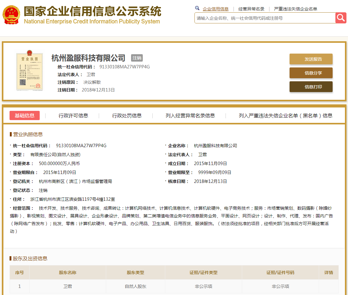 | 公司名称 | 杭州盈服科技有限公司 | 信用代码 | 91330108MA27W7PP4G |