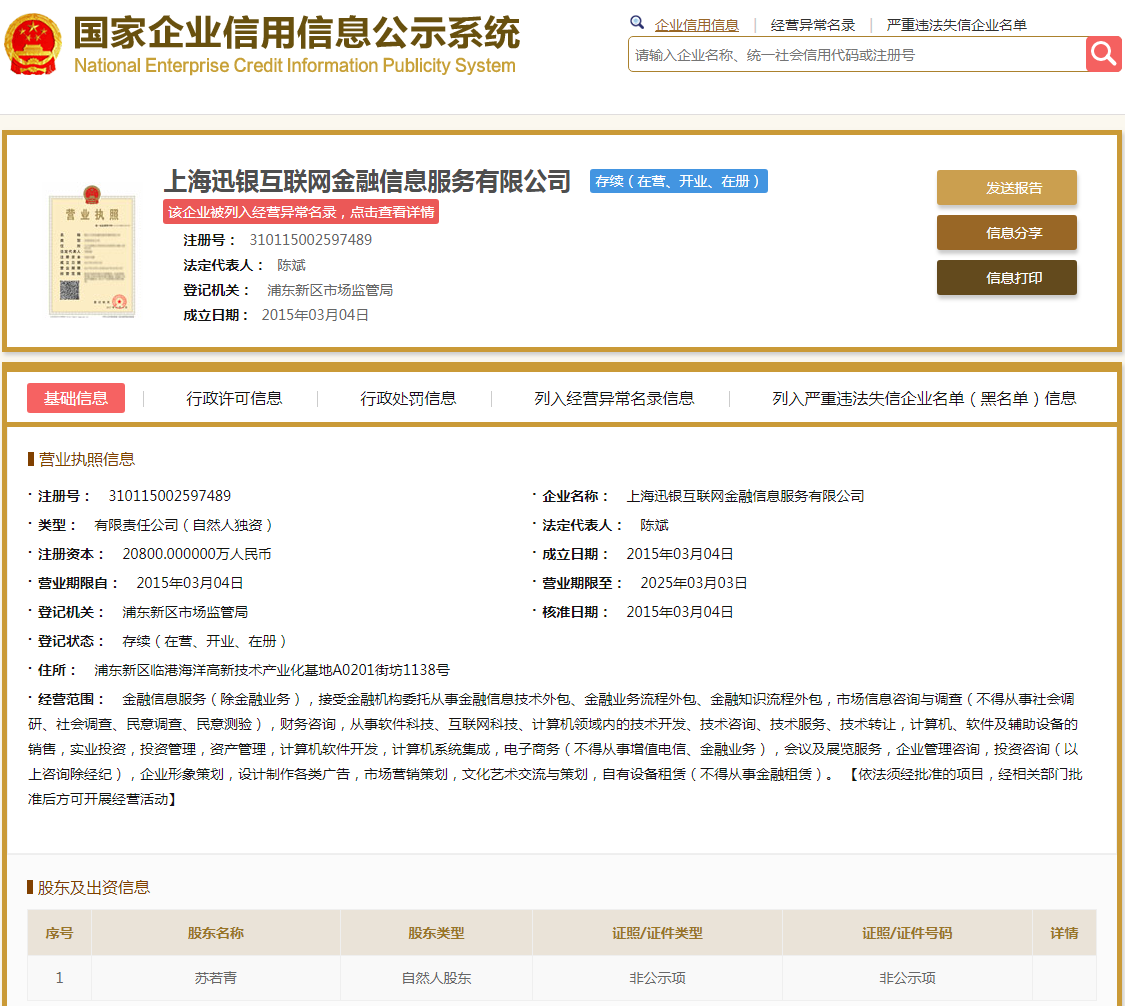 | 公司名称 | 上海迅银互联网金融信息服务有限公司 | 信用代码 | 310115002597489 |