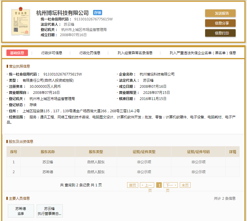 | 公司名称 | 杭州博坛科技有限公司 | 信用代码 | 91330102676775615W |