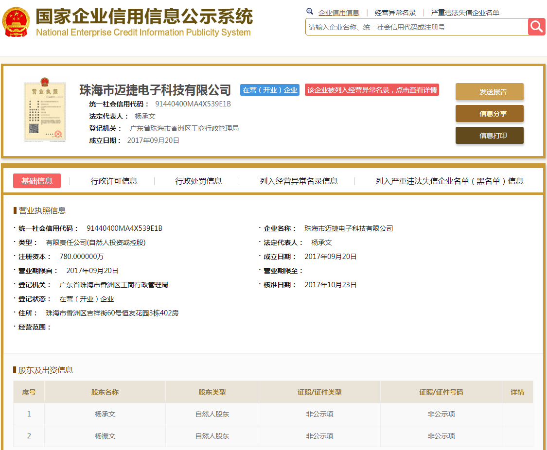 | 公司名称 | 珠海市迈捷电子科技有限公司 | 信用代码 | 91440400MA4X539E1B |