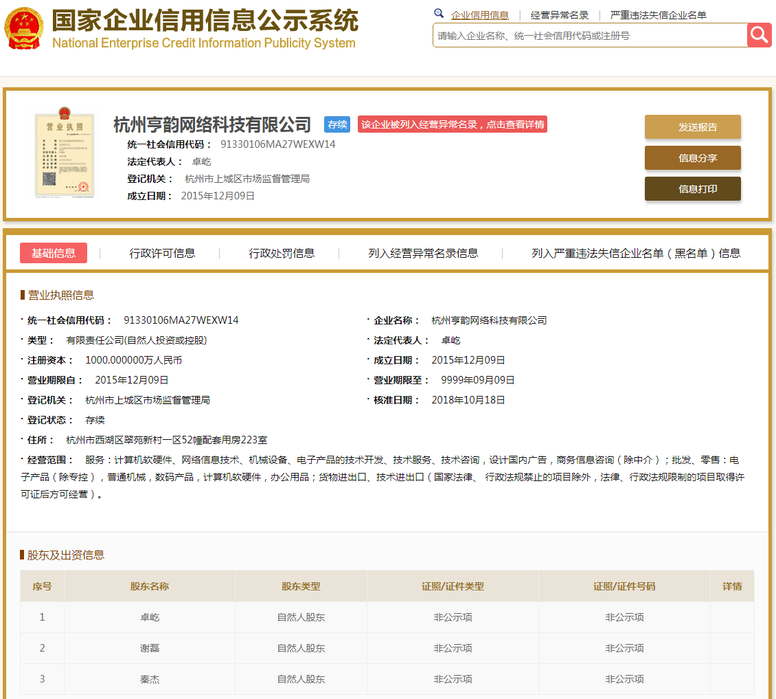 | 公司名称 | 杭州亨韵网络科技有限公司 | 信用代码 | 91330106MA27WEXW14 |
