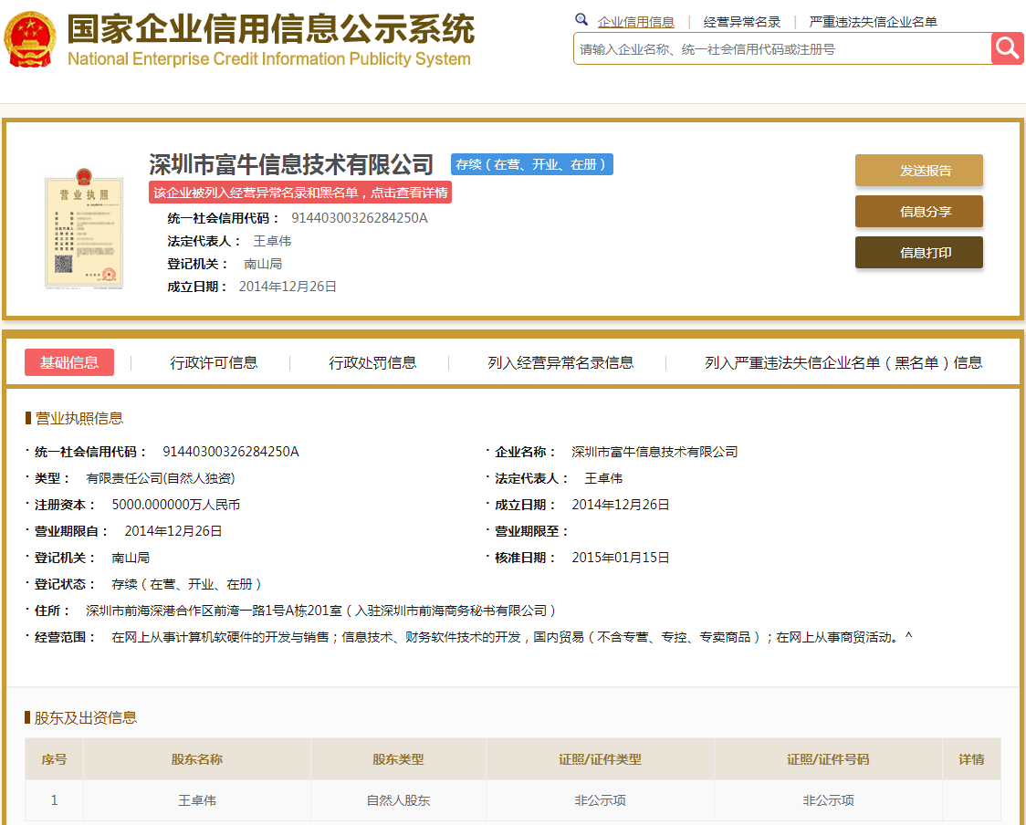 | 公司名称 | 深圳市富牛信息技术有限公司 | 信用代码 | 91440300326284250A |