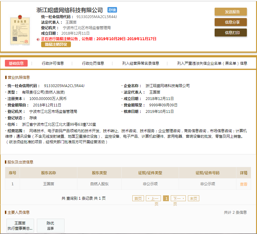 | 公司名称 | 浙江昭盛网络科技有限公司 | 信用代码 | 91330205MA2CL5R44J |