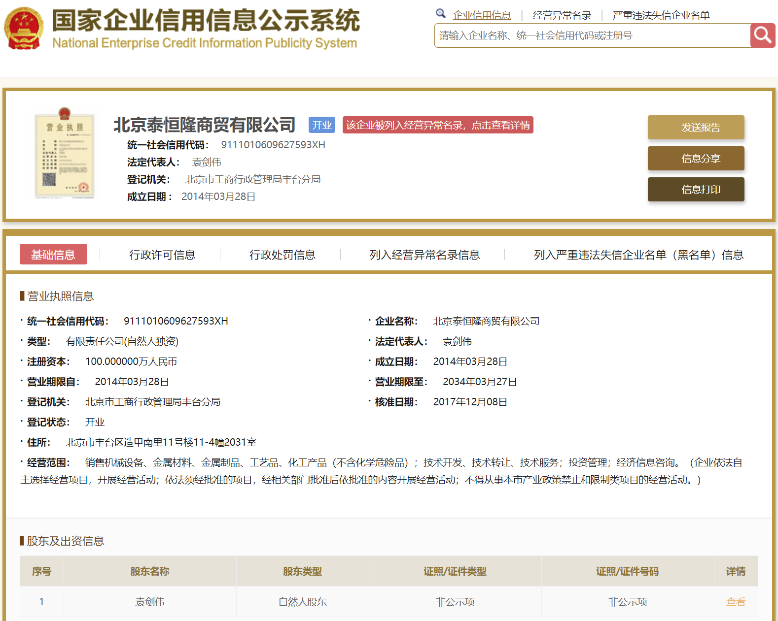 | 公司名称 | 北京泰恒隆商贸有限公司 | 信用代码 | 9111010609627593XH |