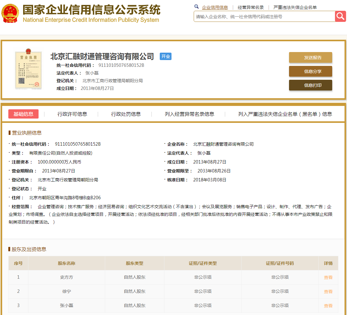 | 公司名称 | 北京汇融财通管理咨询有限公司 | 信用代码 | 91110105076580152B |