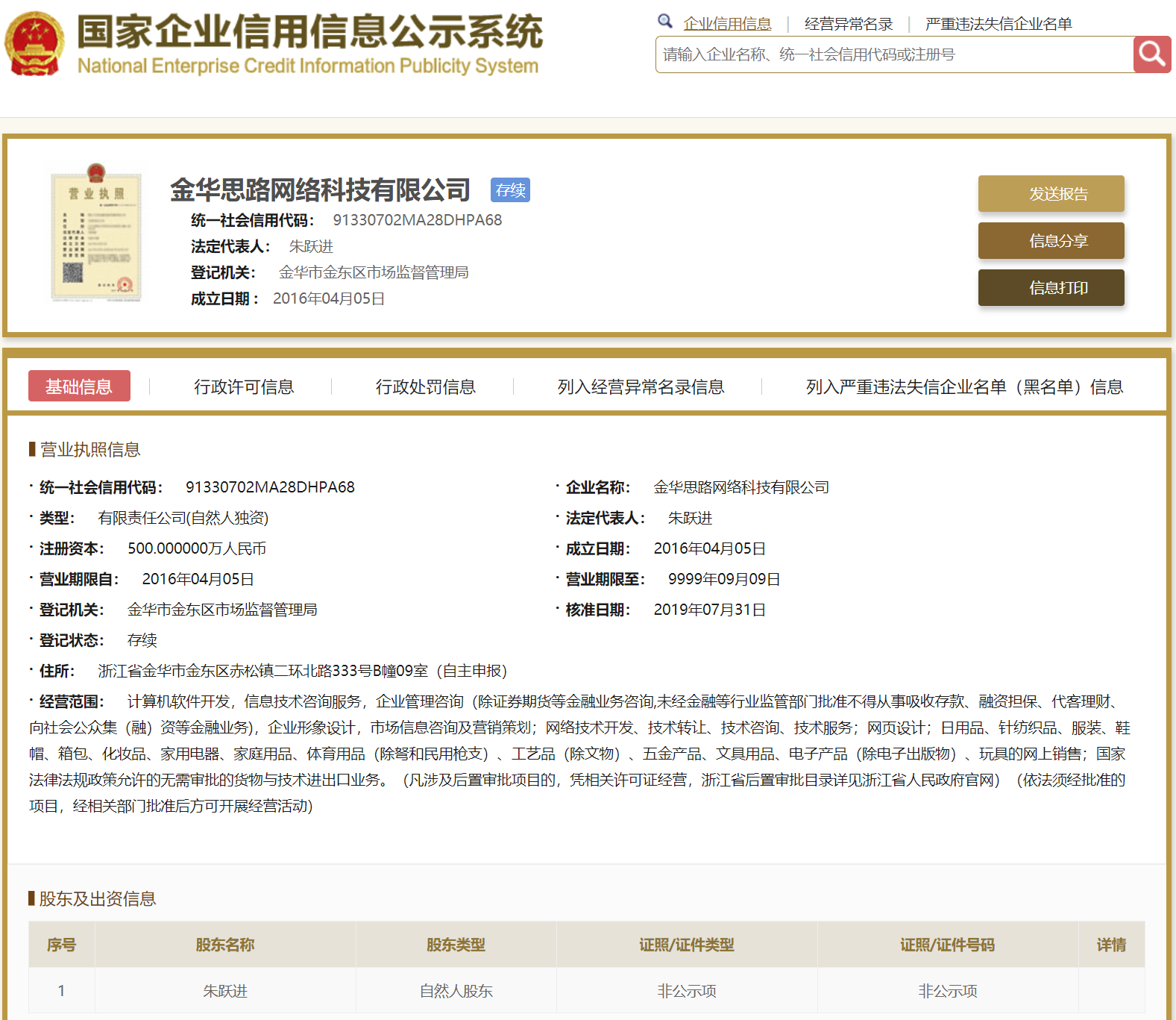 | 公司名称 | 金华思路网络科技有限公司 | 信用代码 | 91330702MA28DHPA68 |