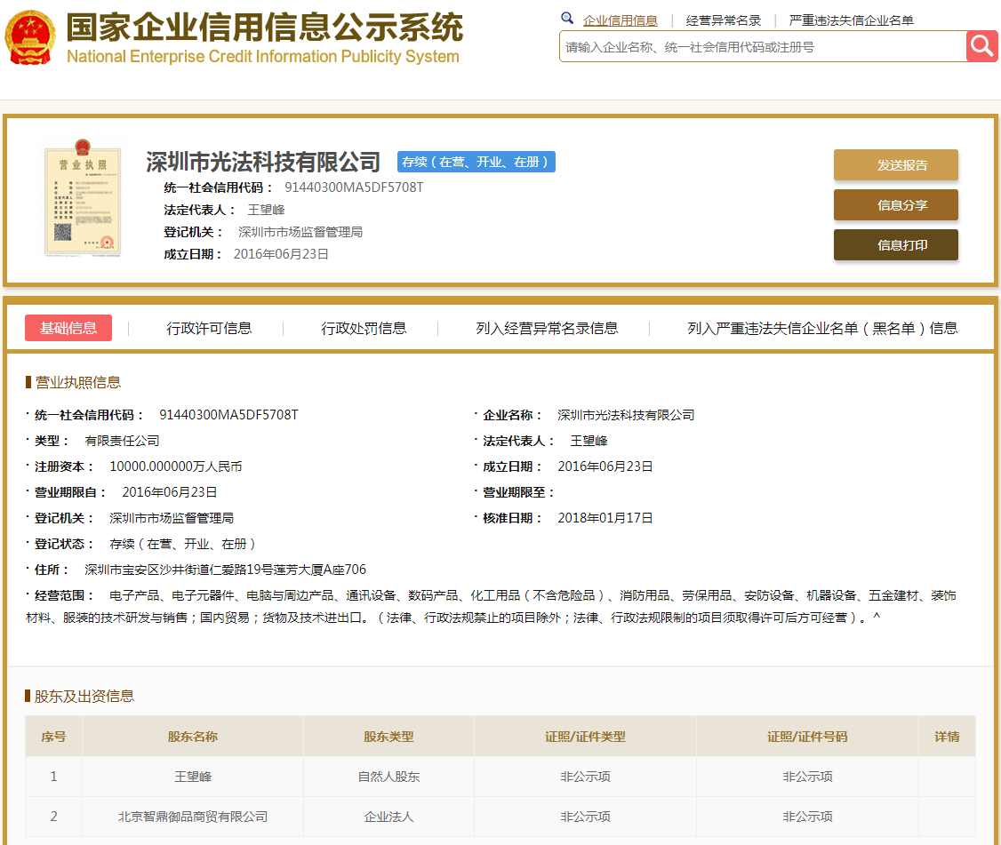 | 公司名称 | 深圳市光法科技有限公司 | 信用代码 | 91440300MA5DF5708T |