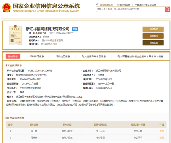 | 公司名称 | 浙江祥福网络科技有限公司 | 信用代码 | 91331100MA2A1CHF99 |